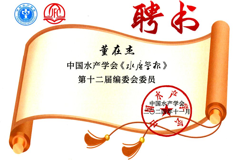 会上,中国水产学会副秘书长赵文武宣读第十二届编委会组成名单,淡水渔业研究中心董在杰研究员继续担任第十二届编委,刘少军主编为编委颁发聘书。