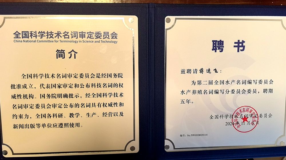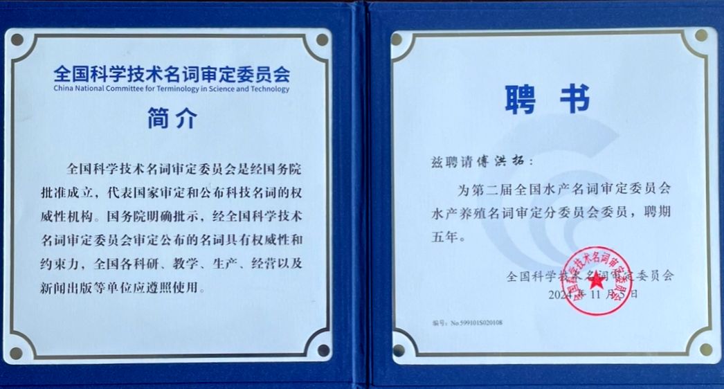 11月5日,第二届全国水产名词委“水产养殖”审定分委员会成立暨编审工作启动会在宁波召开,全国水产名词审定委员会主任委员、上海海洋大学校长万荣,全国科学技术名词审定委员会事务中心审定业务一处处长王海,以及分委会委员出席会议。淡水渔业研究中心水产遗传育种研究室傅洪拓研究员受聘担任“水产养殖”审定分委员会委员,蒋速飞研究员受聘担任“水产养殖”编写分委员会委员。