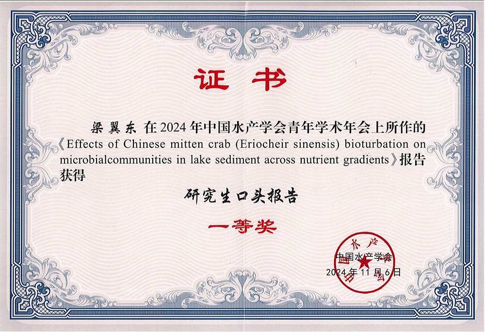 11月6日-7日,2024中国水产学会范蠡学术大会在浙江宁波召开。期间公布了2024年中国水产学会青年学术年会优秀报告。淡水渔业研究中心水生生物资源研究团队博士研究生梁翼东荣获2024年中国水产学会青年学术年会研究生口头报告一等奖。
