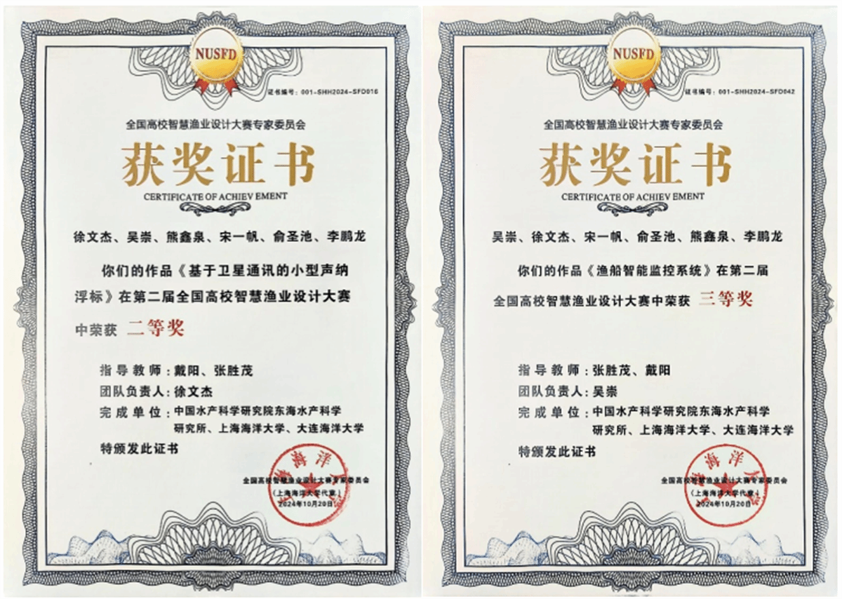 2024年10月,第二届全国高校智慧渔业设计大赛在上海海洋大学举办。环球360会员登录东海水产研究所联合培养研究生吴崇、徐文杰、宋一帆、俞圣池、熊鑫泉、李鹏龙等6人组队参赛并获得喜人成果。其中,《基于卫星通讯的小型声纳浮标》荣获二等奖,《渔船智能监控系统》荣获三奖。主要指导老师是张胜茂研究员和戴阳研究员。