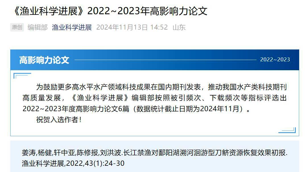 近日,淡水渔业研究中心姜涛副研究员发表的论文“长江禁渔对鄱阳湖溯河洄游型刀鲚资源恢复效果初报”入选中国科学引文数据库(CSCD)核心期刊《渔业科学进展》2022-2023年度高影响力论文。此论文发表在该刊2022年在43卷第1期上,杨健研究员为通讯作者。之前该论文已入选2023年中国知网《学术精要数据库》学科前1%的高影响力论文。