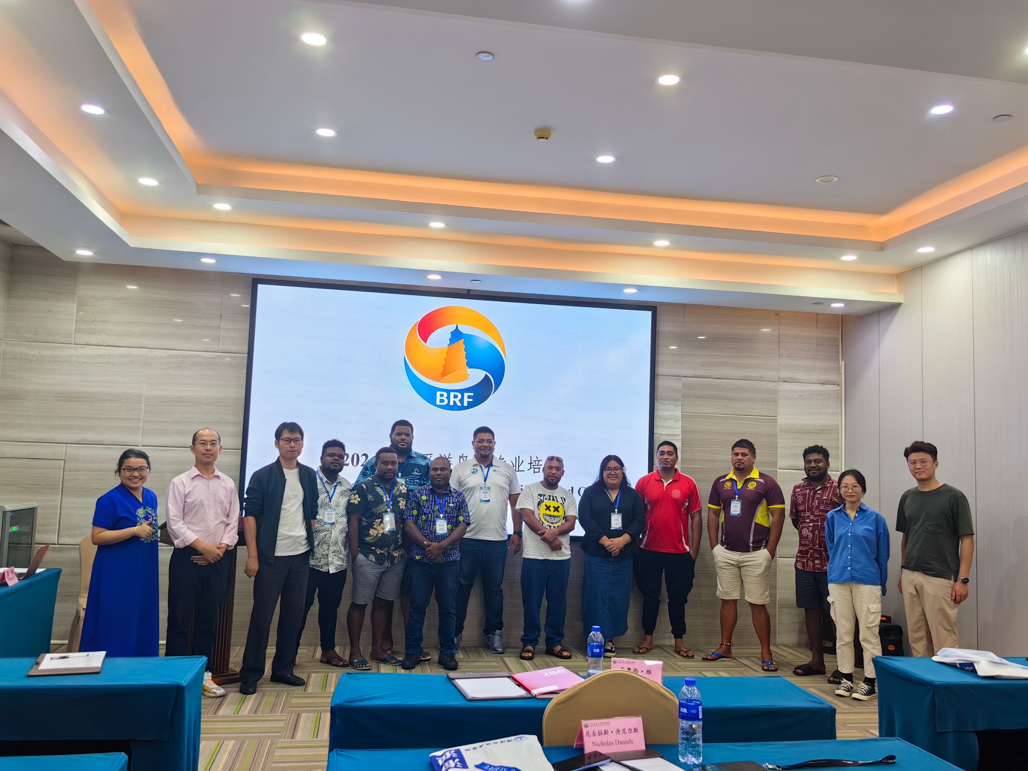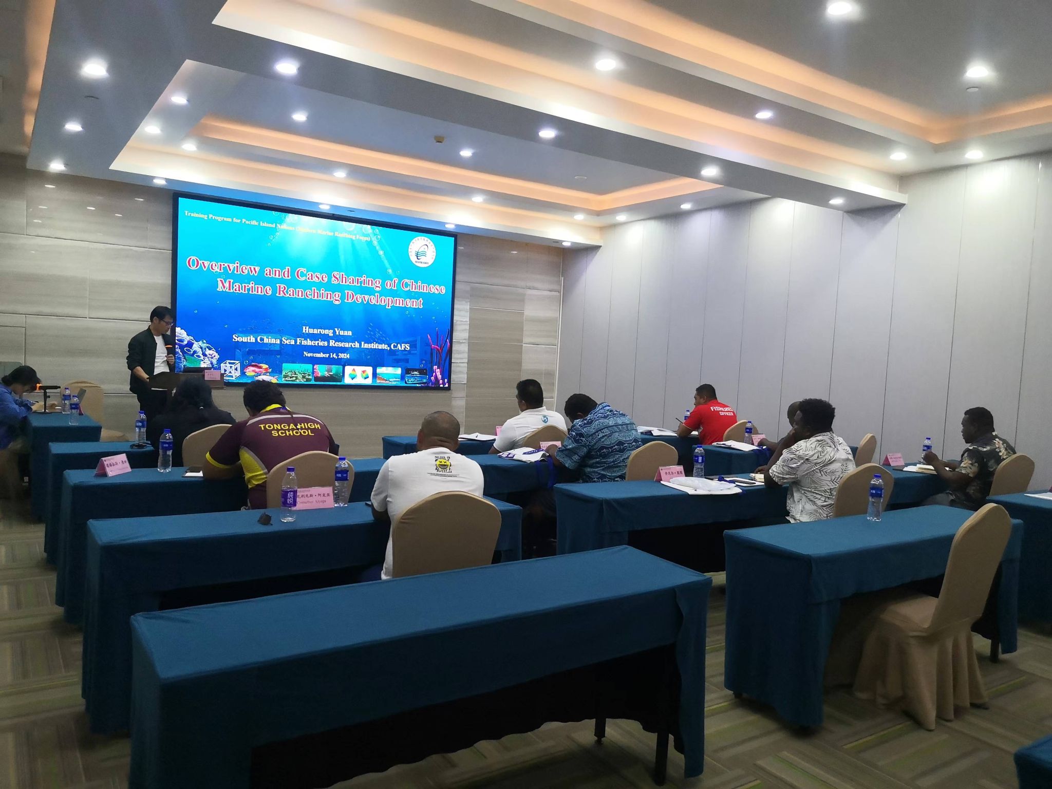 培训班上,袁华荣作了题为“Overview and Case Sharing of Chinese Marine Ranching Development”的专题报告。他以全球渔业资源养护、生态环境修复措施为切入点,结合“一带一路”倡议背景,详细阐述了国际上海洋牧场发展历程和现状,我国海洋牧场建设、技术研究现状及其在资源养护和生境修复中的应用,并以广东省具体某座海洋牧场为例,详细讲解了现代化海洋牧场的建设情况。袁华荣还与现场嘉宾积极互动、交换意见,结合太平洋岛国的实际探讨了其发展现代化海洋牧场的措施。现场气氛热烈,达到了预期效果。