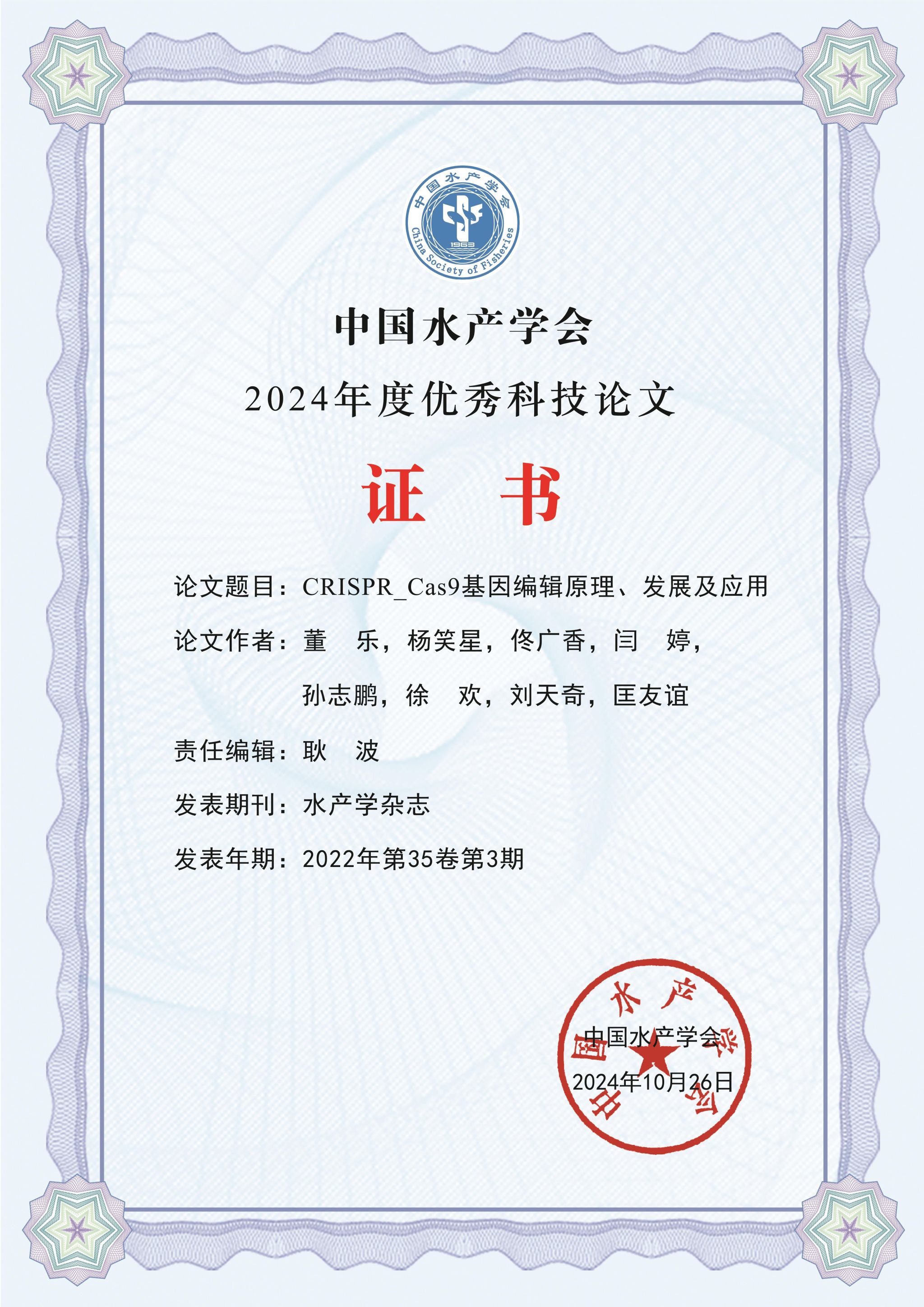日前,中国水产学会2024年度“十佳科技论文”和“优秀科技论文”评选结果发布。由《水产学杂志》发表并推荐的论文《CRISPR_Cas9基因编辑原理、发展及应用》(通信作者匡友谊)获评为中国水产学会2024年度“优秀科技论文”。